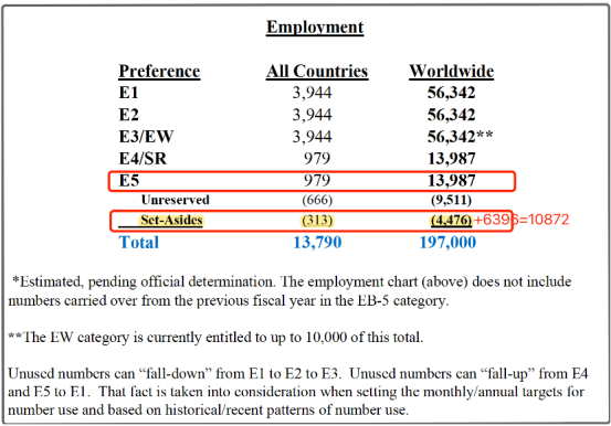 根據(jù)此前公布2023財(cái)年各職業(yè)類別移民簽證配額,EB-5免排期項(xiàng)目總計(jì)配額10,872張,(下圖中E5即為EB5,2023財(cái)年的4,476+2022財(cái)年剩下的6,396=10,872),看下圖。