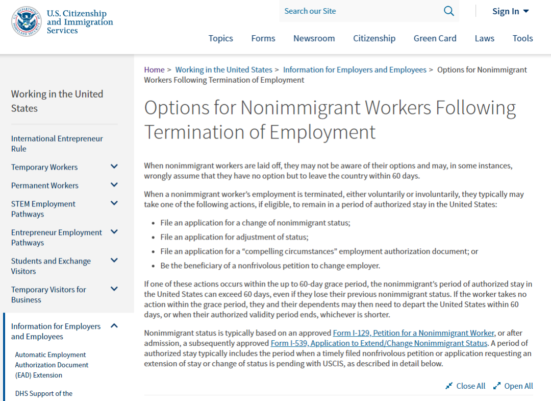 或者,如果改變身份的請(qǐng)求被拒絕,或者新的就業(yè)申請(qǐng)要求領(lǐng)事或入境口岸通知,個(gè)人必須離開(kāi)美國(guó),并在開(kāi)始新的工作之前以就業(yè)授權(quán)的分類(lèi)被接納。當(dāng)非移民員工的雇傭關(guān)系終止時(shí),在符合條件的情況下,他們通??梢圆扇⌒袆?dòng)延長(zhǎng)在美國(guó)的合法逗留時(shí)間。這些行動(dòng)包括申請(qǐng)改變非移民身份;提出身份調(diào)整申請(qǐng);提出“令人信服情況”就業(yè)授權(quán)文件申請(qǐng)等。若員工在寬限期內(nèi)沒(méi)有采取行動(dòng),他們及其家屬可能需要在60天內(nèi)或其授權(quán)有效期結(jié)束時(shí)離開(kāi)美國(guó),以較短者為準(zhǔn)。