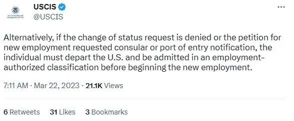 如果改變身份的請(qǐng)求被拒絕,或者新的就業(yè)申請(qǐng)要求領(lǐng)事或入境口岸通知,個(gè)人必須離開(kāi)美國(guó),并在開(kāi)始新的工作之前以就業(yè)授權(quán)的分類(lèi)被接納。