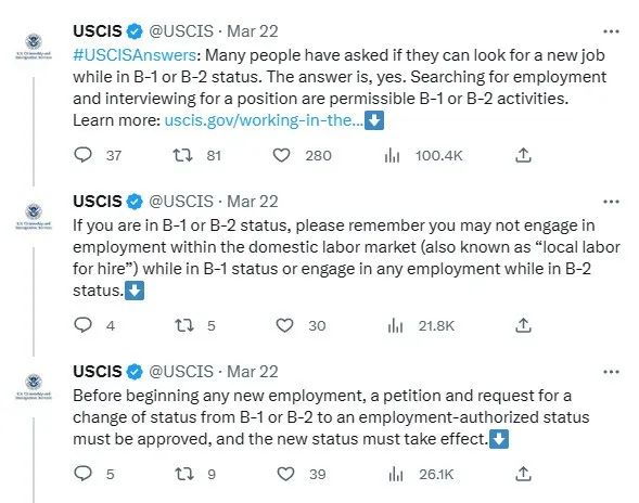 美國(guó)移民局在推特中表示:“許多人問(wèn)他們是否可以在B-1或B-2身份下尋找新工作。答案是肯定的。求職和面試職位是允許使用B-1簽證的。”