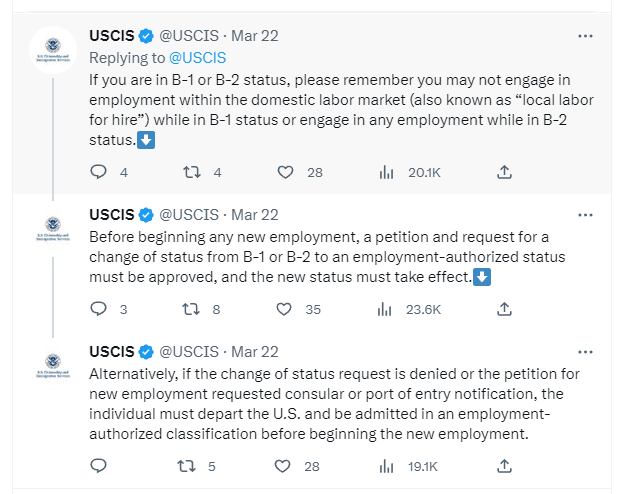眾所周知,商務(wù)/旅游簽證(B-1/B-2 Visa)是不能在美國(guó)工作的。不過(guò),3月22日,美國(guó)移民局(USCIS)在官方推特上正式說(shuō)明:旅游簽證可以在美國(guó)找工作!引起了網(wǎng)上極大的關(guān)注。