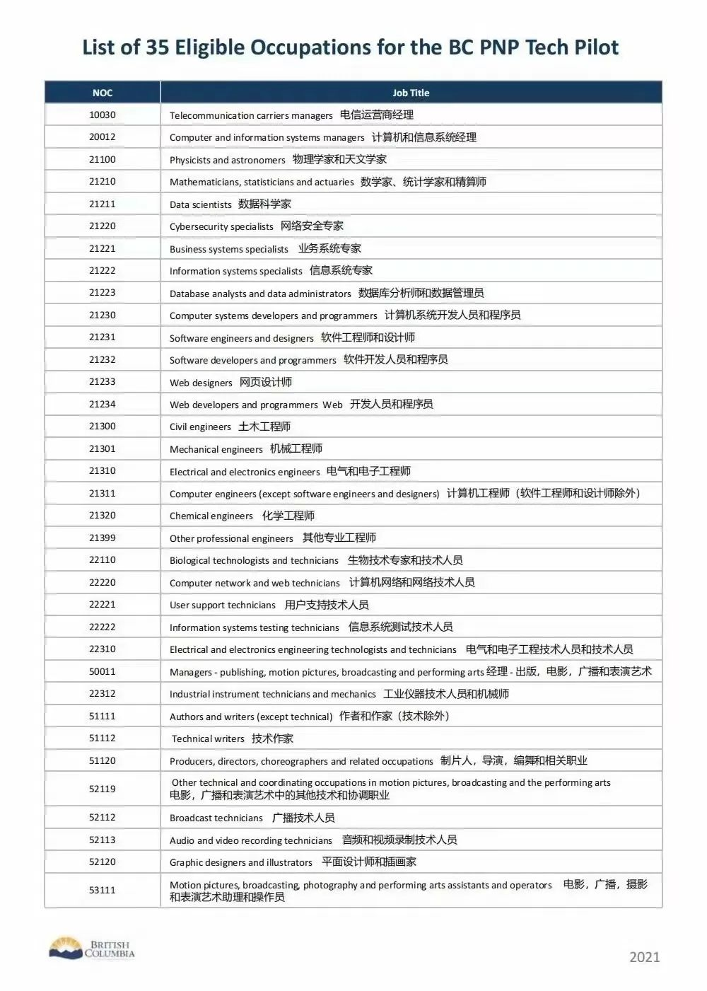 職位:獲得一年工作時(shí)間的BC省內(nèi)的雇主offer,如果要走【BCPNP Tech】,需要滿足該項(xiàng)目列表中的35個(gè)職位要求;